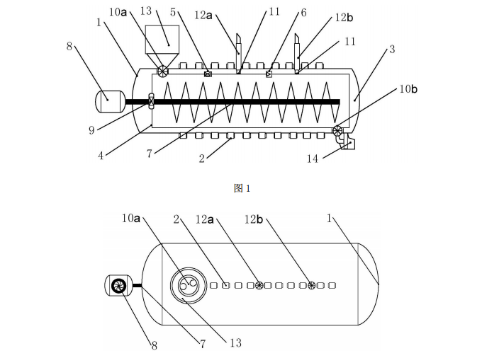 本實用新型裝置的微波源由裝嵌在不銹鋼主殼體的微波加熱單元發(fā)射,對主殼體的內(nèi)腔中的硅酸鋁反應(yīng)管進行輻照。反應(yīng)管內(nèi)的土壤由 不銹鋼絞龍推進,不銹鋼絞龍 7 由電機 8 帶動 ;本裝置的進料與出料由星形閥 控制,反應(yīng)器內(nèi)的解吸氣從帶屏蔽網(wǎng)格 11 的抽提管抽出。