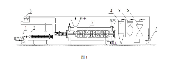 本發(fā)明的目的是提供一種強制通風-螺旋攪拌土壤熱解吸修復有機污染土壤的系統(tǒng), 被預熱后的熱空氣進入熱解吸裝置中,與受污染的土壤充分接觸,同時利用電加熱元件加 熱土壤,將受污染的土壤加熱至足夠溫度,使得揮發(fā)性 / 半揮發(fā)性污染物從土壤中揮發(fā)回 來,被熱氣流快速帶走并被處理,土壤得以凈化。