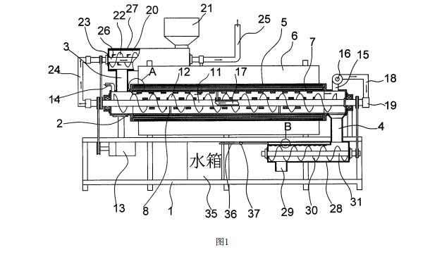 土壤從進(jìn)料斗處進(jìn)入預(yù)加熱筒內(nèi),進(jìn)料絞龍軸內(nèi)的高溫氣體對(duì)土壤進(jìn)行預(yù)加熱,提高土壤溫度,同時(shí)進(jìn)料絞龍軸上的刀片把塊狀土壤切碎,預(yù)加熱并切碎后的土壤進(jìn)入加熱筒內(nèi)被二次加熱,加熱過程中,螺旋帶、轉(zhuǎn)筒對(duì)土壤進(jìn)行翻轉(zhuǎn)、分散,提高土壤加熱效率,溫度加熱到150℃以上時(shí),土壤中的中苯、甲苯、二甲苯、乙苯等有害物質(zhì)從土壤中揮發(fā)出來(lái)形成氣態(tài),氣態(tài)的毒害物質(zhì)被排風(fēng)機(jī)吸走,最后從尾氣管中排入尾氣處理塔內(nèi),土壤經(jīng)過熱脫附后,土壤中的蟲卵、雜草種子被高溫殺死,土壤中的毒害有機(jī)物被脫附、分解、排放、處理掉,最后干燥的土壤進(jìn)入后處理筒內(nèi),水箱中的肥料溶液噴灑到土壤中,對(duì)土壤進(jìn)行增濕、降溫、增肥,最后從排料通道處排出的土壤就能直接用于園林、農(nóng)田、菜園使用。