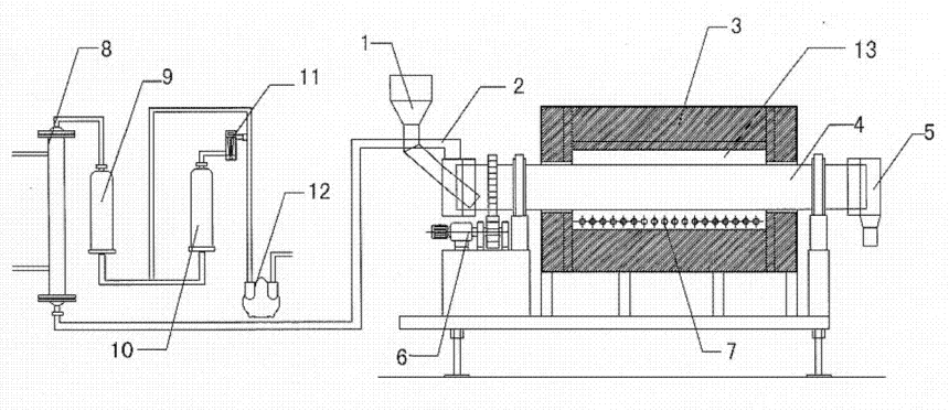 滾筒的前端和后端分別由支撐滾圈支撐 ;所述滾筒的內(nèi)腔設(shè)置有螺旋導(dǎo)料板和翻料板,以保證均勻加熱物料 ;所述滾筒的外壁鑲嵌有傳動齒輪圈,所述傳動齒輪圈由減速電機(jī)和傳動小齒輪驅(qū)動。滾筒采用耐熱不銹鋼材料,外部加熱爐爐膛為耐火纖
