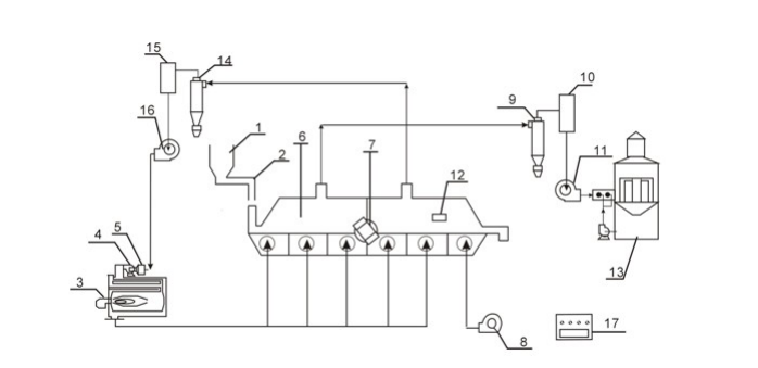 2、步驟1產(chǎn)生的熱風由熱風進口進入振動床,料倉1內(nèi)的污染土壤經(jīng)螺旋輸料管從進料口進入振動床,振動電機帶動振動床振動,污染土壤在振動床內(nèi)由進料口向出料口振動推進,推進過程中被熱風加熱,溫度逐漸升高。