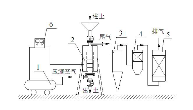一種土壤熱解吸系統(tǒng),其特征在于 :由立式解吸爐和空氣壓縮機組成,立式解吸爐為圓筒狀設備,外壁設置電加熱元件。污染土壤由進料斗加入,通過電加熱元件間接加熱土壤至足夠溫度,使得污染土壤中揮發(fā)性 / 半揮發(fā)性有機物揮發(fā)出來,同時空氣經(jīng)空氣壓縮機壓縮后由底部進入立式解吸爐與污染土壤混合接觸,揮發(fā)出來的污染氣體在壓縮空氣的作用下快速帶出土壤熱解吸系統(tǒng)進入尾氣處理系統(tǒng)。壓縮空氣流量可以調(diào)節(jié),流量較小時,解吸爐以立式固定床方式運行,小的土壤顆粒不致被氣流帶走,可確保小的土壤顆粒在爐內(nèi)有足夠的停留(加熱)時間 ;流量較大時,土壤顆粒在爐內(nèi)處于流化狀態(tài),解吸爐以流化床方式運行,此時,壓縮空氣可起到混合土壤的作用,并使土壤顆粒受熱均勻。