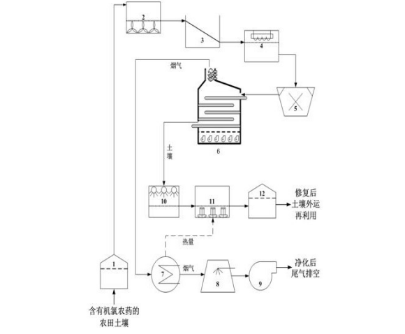 待修復的含有機氯農藥成分的農田土壤集中儲存于原土料斗中,在此進行集中收集并完成初步穩(wěn)定過程,原土料斗中的待修復土壤通過螺旋提升輸送機輸送至鼓風分選機,在此去除土壤中的塑料、紙張等低密度、大體積雜物,鼓風分選機的出口通過傳送帶連接振動篩分機,在此去除土壤中較高密度、大粒徑的雜質,振動篩分機的出口通過傳送帶連接磁力篩分機,在此去除土壤中的金屬雜質,磁力篩分機的出口通過傳送帶連接研磨粉碎機,在此將土壤研磨至粒徑小于10mm,研磨粉碎機的出口通過傳送帶連接熱脫附-等離子裂解反應器,熱脫附-等離子裂解反應器的出料口通過傳送帶連接調節(jié)式噴淋塔,在此進行進一步淋洗凈化,去除可溶性雜質,調節(jié)式噴淋塔的出口通過傳送帶連接余熱烘干機,在此將經淋洗土壤中所含的水分烘干去除,余熱烘干機的出口通過傳送帶連接修復土壤儲倉,經修復后的土壤外運再利用,同時,熱脫附-等離子裂解反應器的廢氣出口通過廢氣管線連接余熱交換器,在此收集廢氣中的剩余熱量,使廢氣溫度降低,余熱交換器的出口通過廢氣管線連接水洗凈化塔,廢氣在此經過水洗凈化并進一步降溫,水洗凈化塔的出口通過廢氣管線連接引風機,將經過凈化處理的尾氣排空,同時余熱交換器所收集到的剩余熱量通過熱力管線輸送至余熱烘干機加以利用。
