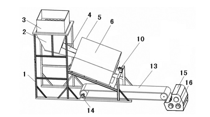 本發(fā)明的目的在于解決上述問題,提供一種土壤篩分及破碎裝置,它采用振動篩、篩分筒、輸送帶和旋切與滾錘裝置等機械結(jié)構(gòu),能完成對土壤的高速破碎、篩分、自動加藥、混合攪拌等工作,能積極有效地向被污染的土壤中添加液態(tài)或固態(tài)藥劑,是治理重金屬污染土壤的一種比較有效的機械破碎設(shè)備,且在制造上容易實現(xiàn),操作方便。