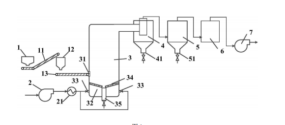 本發(fā)明實施例是這樣實現(xiàn)的,一種污染土壤熱解析設(shè)備異位解吸脫附修復系統(tǒng),所述系統(tǒng)包 括 :土壤破碎機 1、送風機 2、流化床 3 和旋風分離器 4 ; 所述土壤破碎機 1 對污染土壤進行破碎處理后生成污染土壤顆粒,輸入所述流化 床3; 所述送風機 2 的出風口與加熱器 21 的進風口相連,加熱器 21 的出風口通過管道 與所述流化床 3 的進風口 33 連接,根據(jù)所述污染土壤的污染物的性質(zhì),通過加熱器 21 對 流化空氣的溫度進行調(diào)節(jié),加熱后的流化空氣進入所述流化床 3 開始流化所述污染土壤顆 粒 ;所述流化床 3 上端還連接所述旋風分離器 4,所述污染土壤顆粒在流化的同時不 斷被所述流化空氣帶出至所述旋風分離器 4,干凈土壤顆粒經(jīng)所述旋風分離器 4 分離后從 所述旋風分離器 4 下端的凈土出料口 41 排出。 進一步的,進料的所述污染土壤的含水率不大于 20% ; 所述土壤破碎機 1 處理后生成的所述污染土壤顆粒的粒徑小于 30mm。 進一步的,所述土壤破碎機 1 通過喂料傳送機 11、土壤儲倉 12 和定量給料機 。.